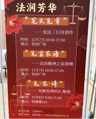 为深入弘扬宪法精神、涵养校园法治文化,法学院研究生学生会于国家宪法日之际,组织开展了“宪蕴诗心,法润芳华”主题宣传教育活动。本次活动以创意为导向、以参与为核心,通过“宪法三行诗”创作与“法治精神之花”馈赠等环节,将宪法学习与艺术表达、情感传递相结合,引领师生在沉浸式体验中感悟宪法力量,筑牢法治信仰。